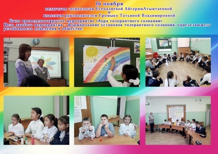 16 ноября педагогам -психологам Есеналиевой АйгеримАтымтаевной и классным руководителем Громыко Татьяной Владимировной Было проведенооткрытое мероприятие «Аура толерантного сознания».Цель данного мероприятия – формирование установок толерантного сознания, определяющего устойчивость поведения в обществе.